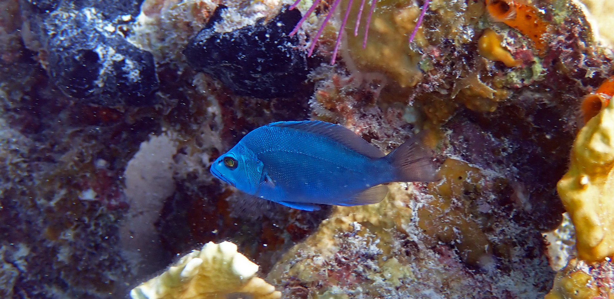 Back at Glover's ReefJuvenile fishes are particularly appealing, wrapped in bright colors and delightfully tiny, like this Cocoa Damselfish